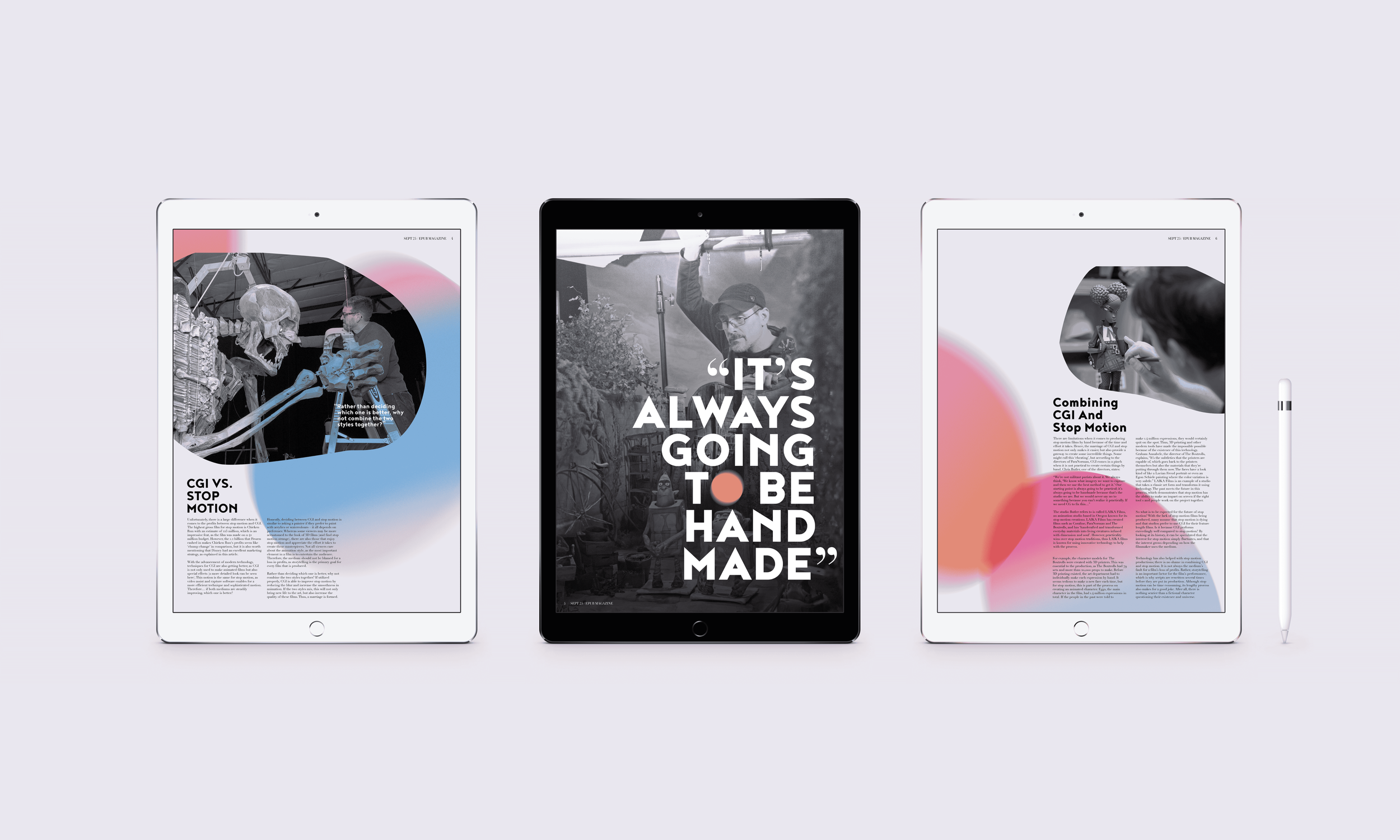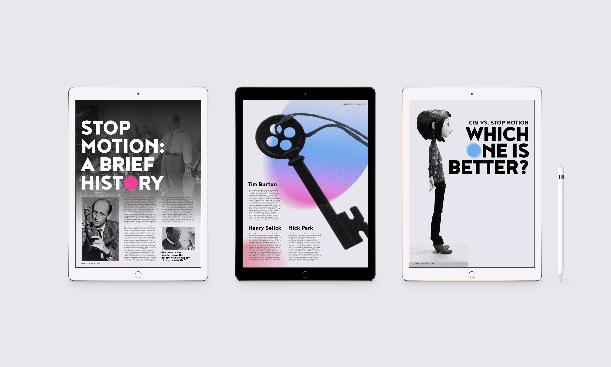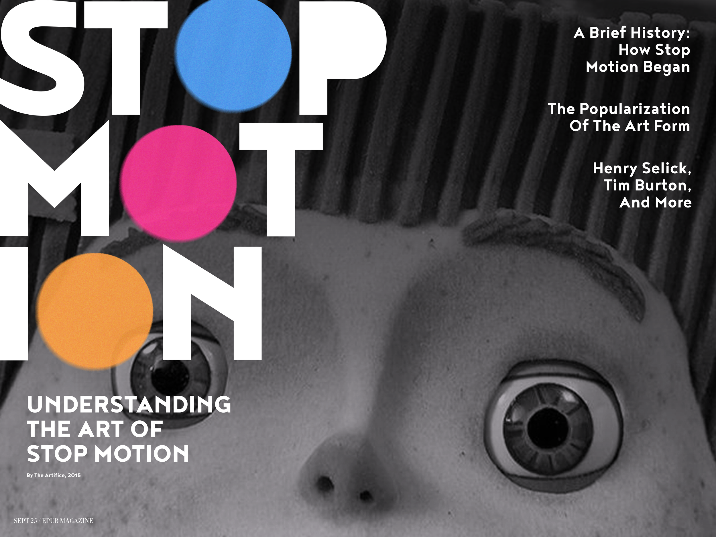 This electronic publication of an existing article by The Artifice, titled Understanding the Art of Stop Motion, touches on the history of the art form and the important people involved in the film genre. I developed compelling, colorful editorial spreads that emphasize the uniqueness of stop motion animation and ultimately show my own fascination towards the human-involved art form while effectively displaying text information.